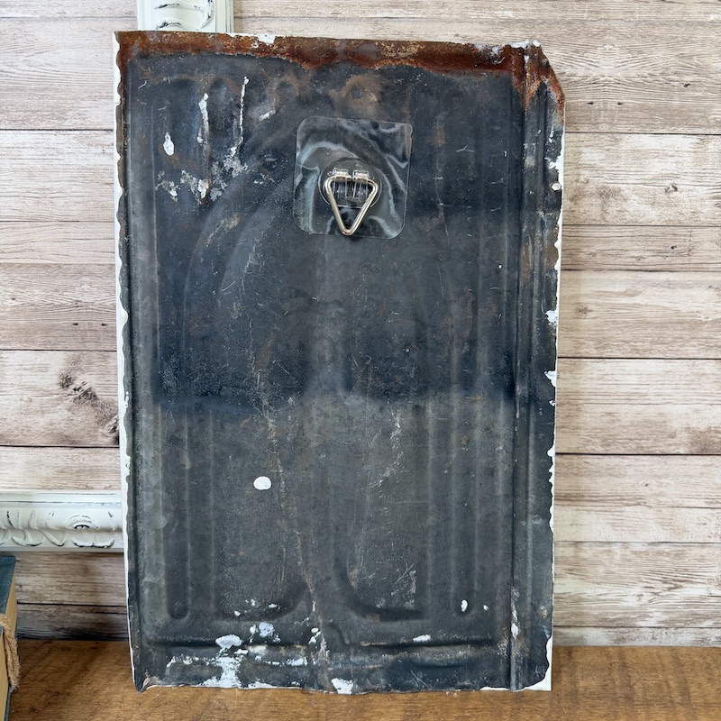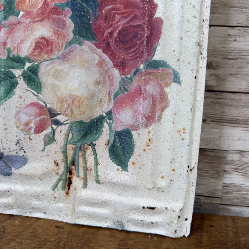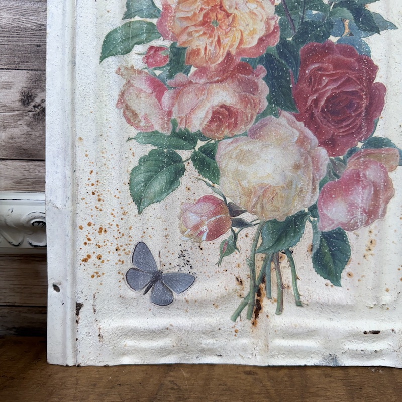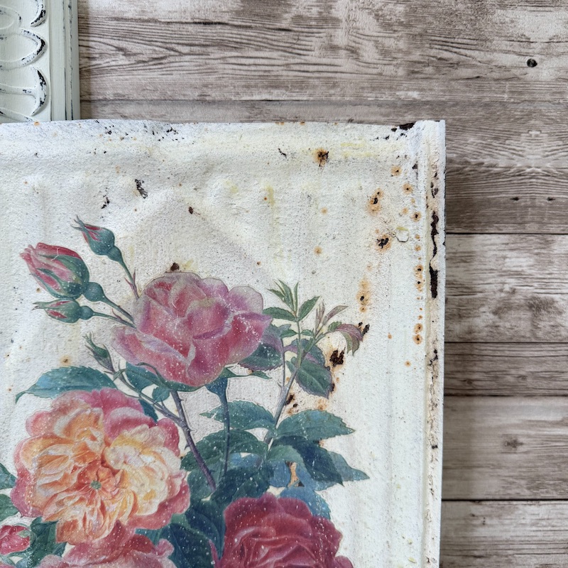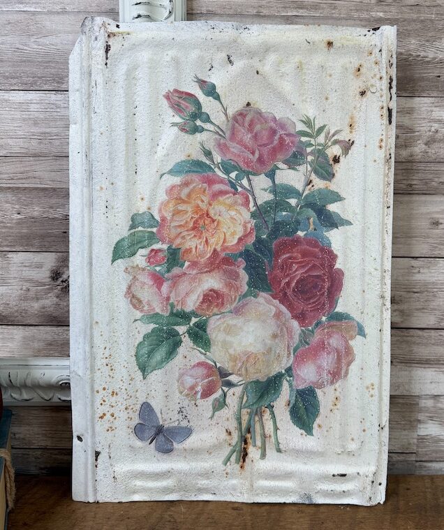 This antique tin tile was given a new life with a sweet floral bouquet transfer from Iron Orchid Designs. A hanger has been attached to the back and the tile measures approximately 14″ x 9.25″.