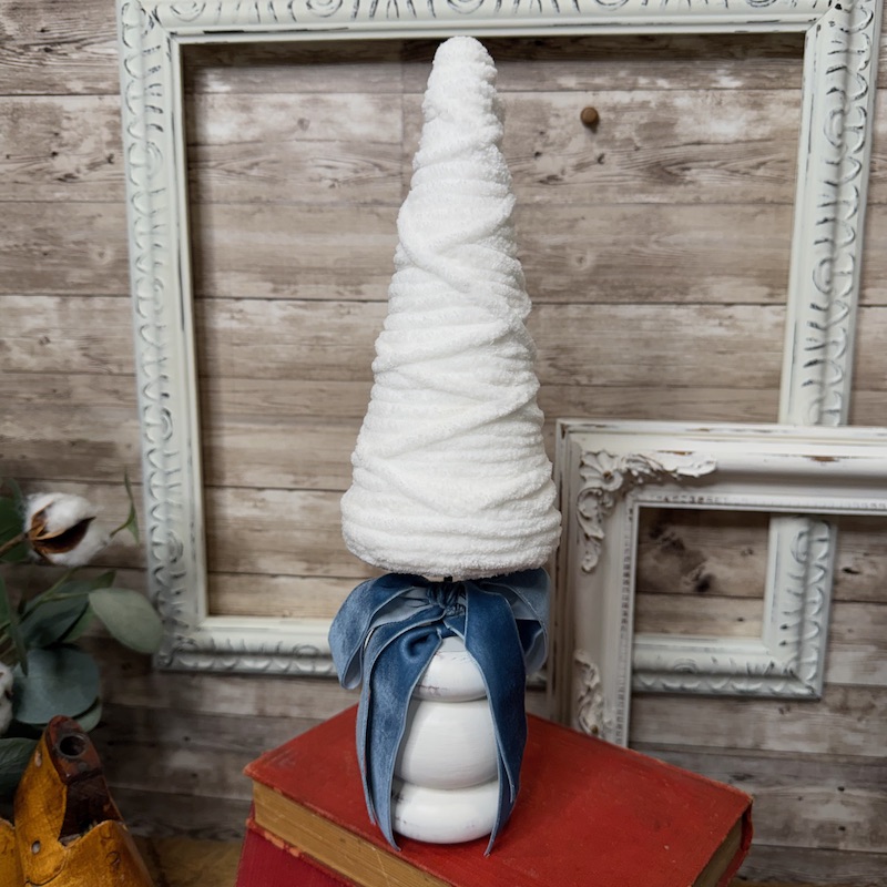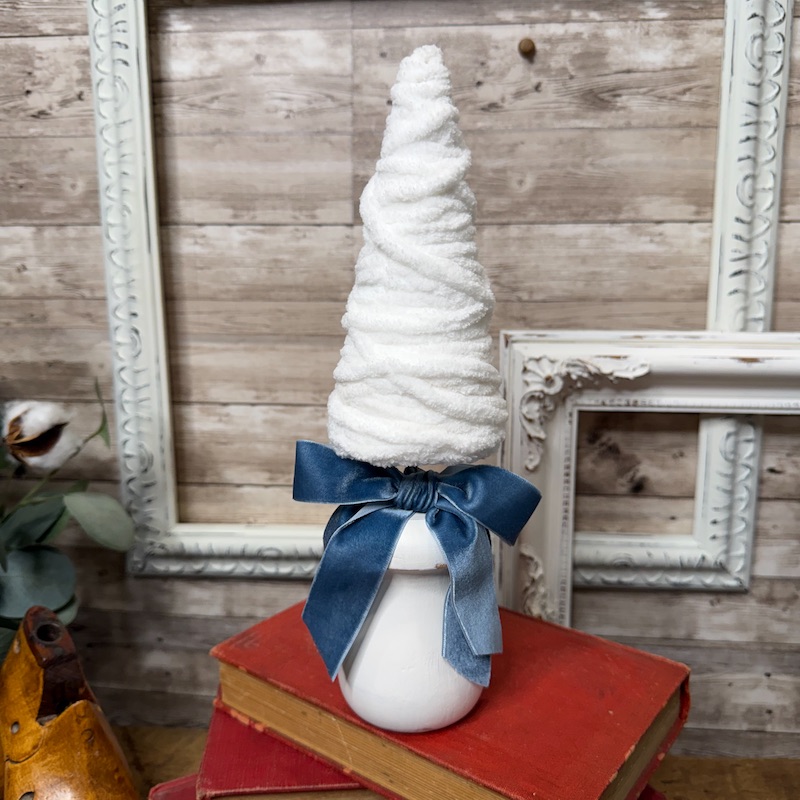 This beautiful quad of Christmas Trees on distressed wooden bases would look beautiful as a set, or on their own. The simple and elegant white will blend seamlessly with your holiday decor. The trees are wrapped with a soft white yarn and the bases and painted parts of a furniture leg. Each tree is adorned with a blue velvet bow.