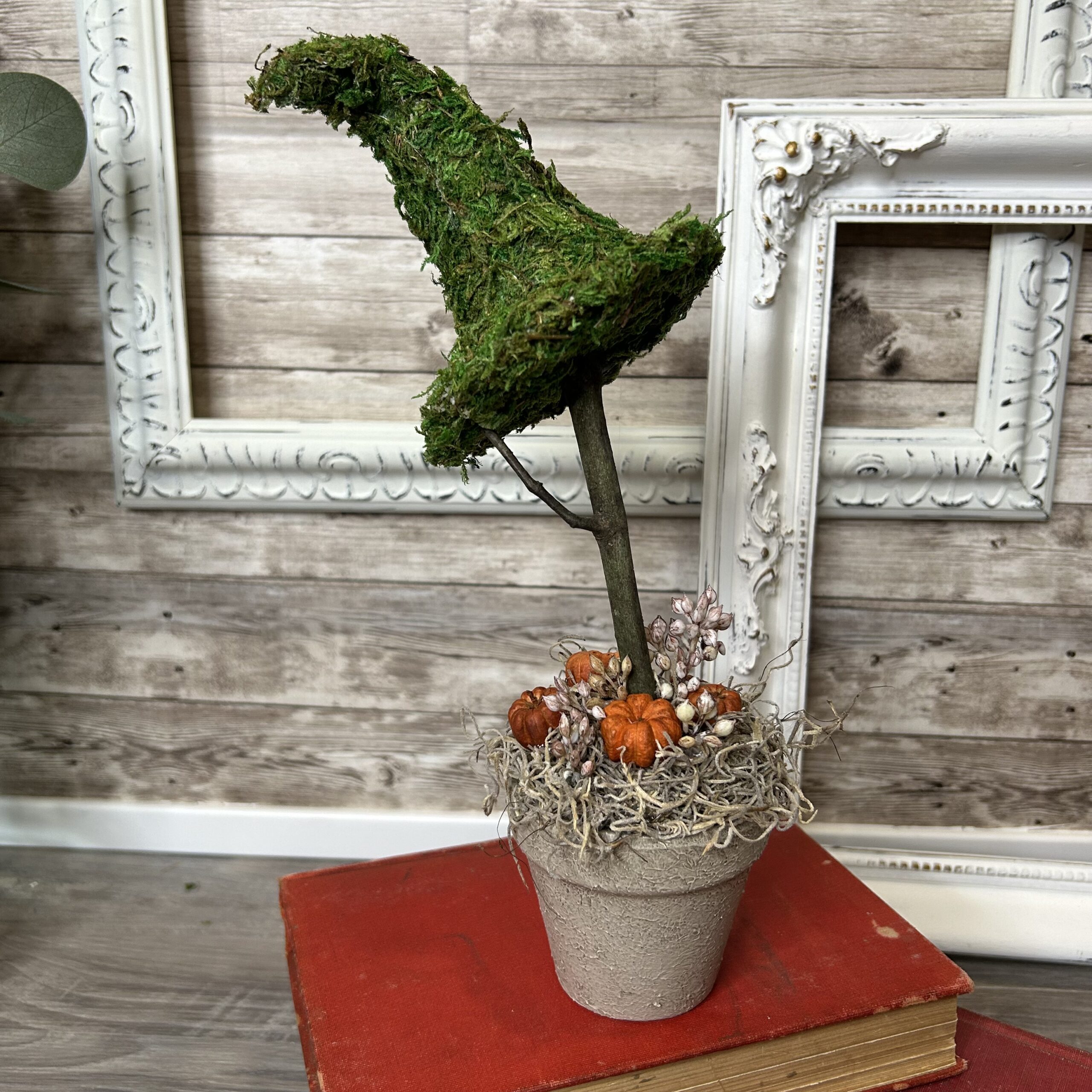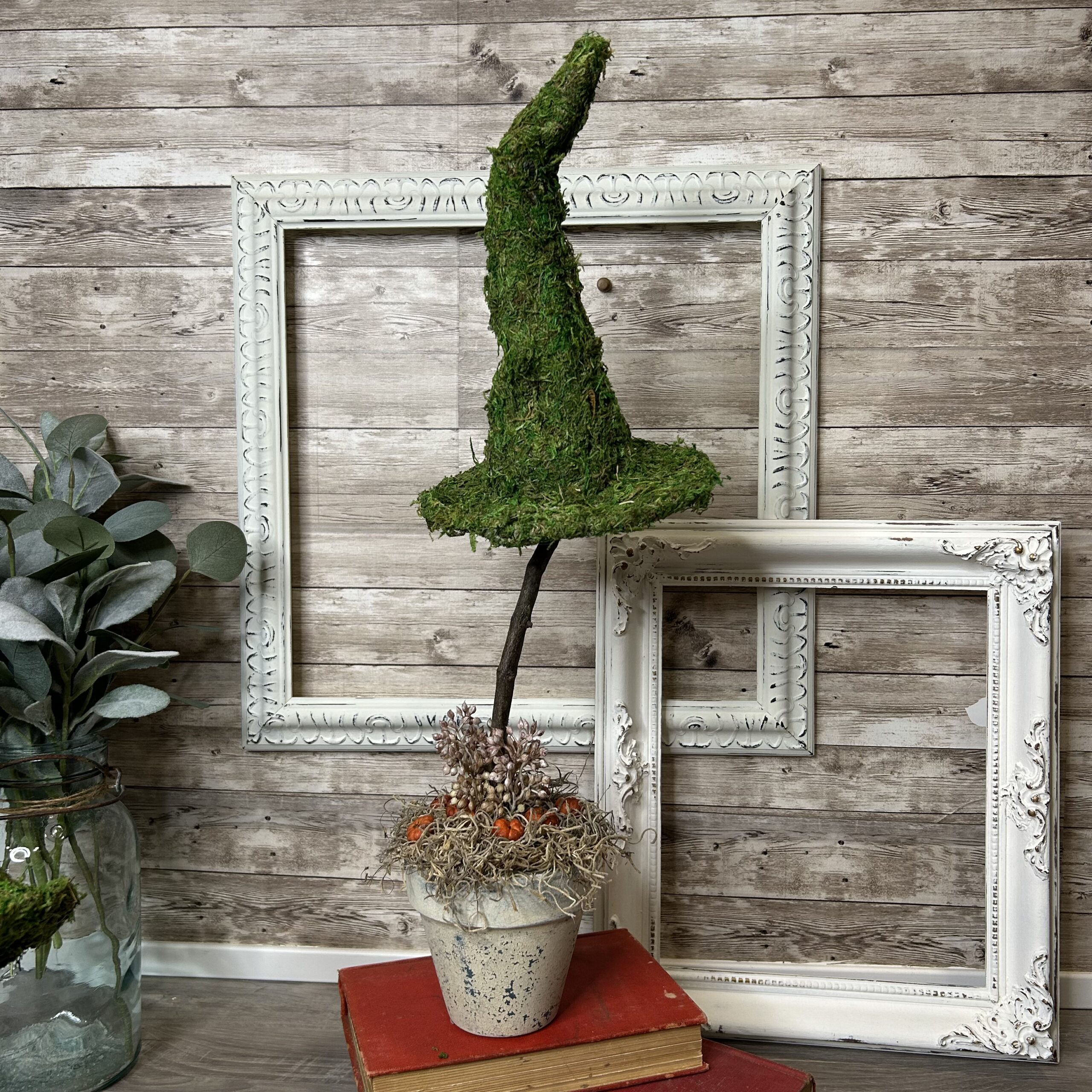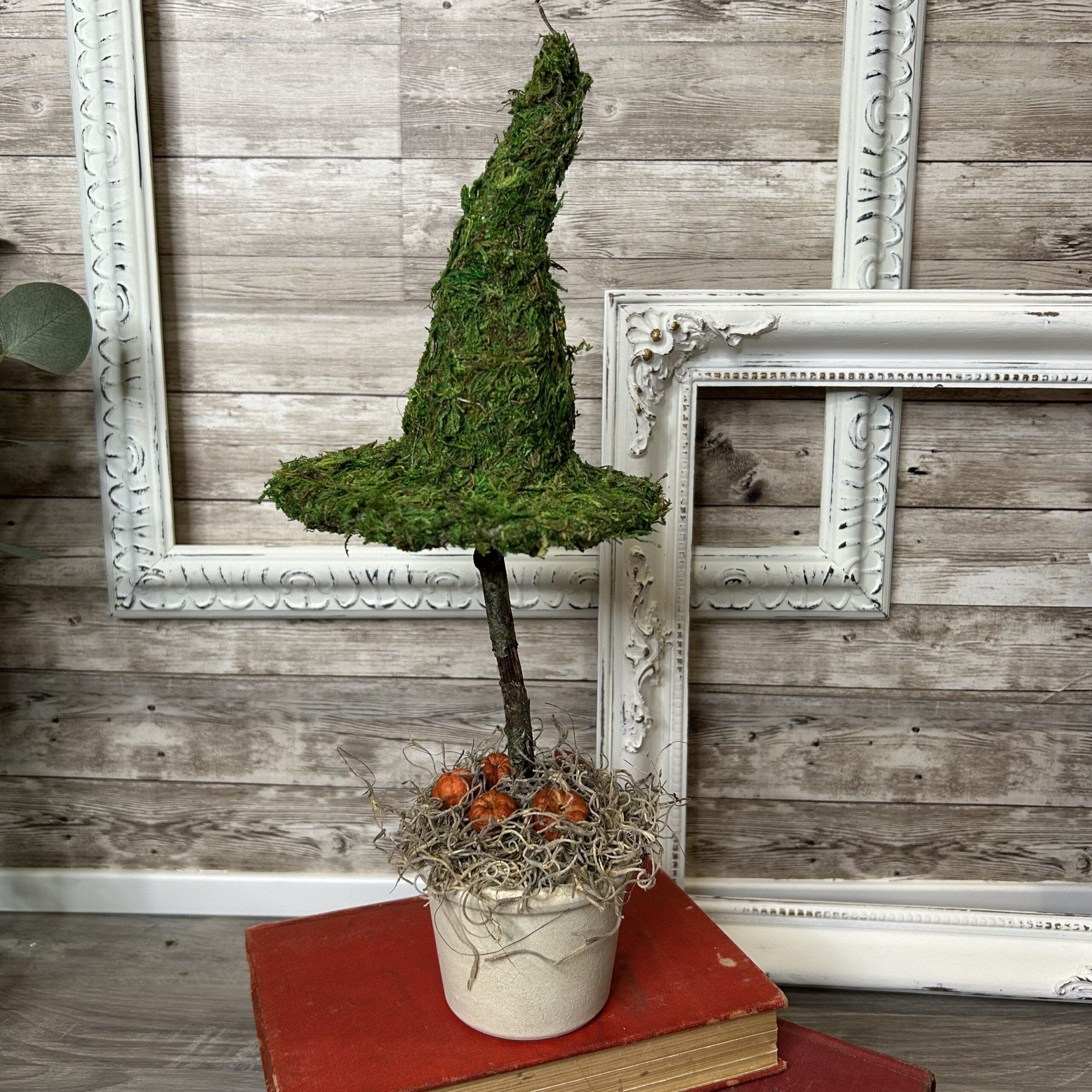 These one of a kind witch hats were crafted from scratch and covered in moss. They’re secured in decorative pots for the perfect addition to any fall themed decor.