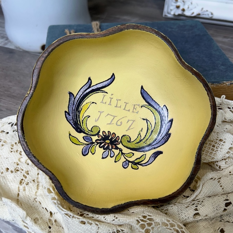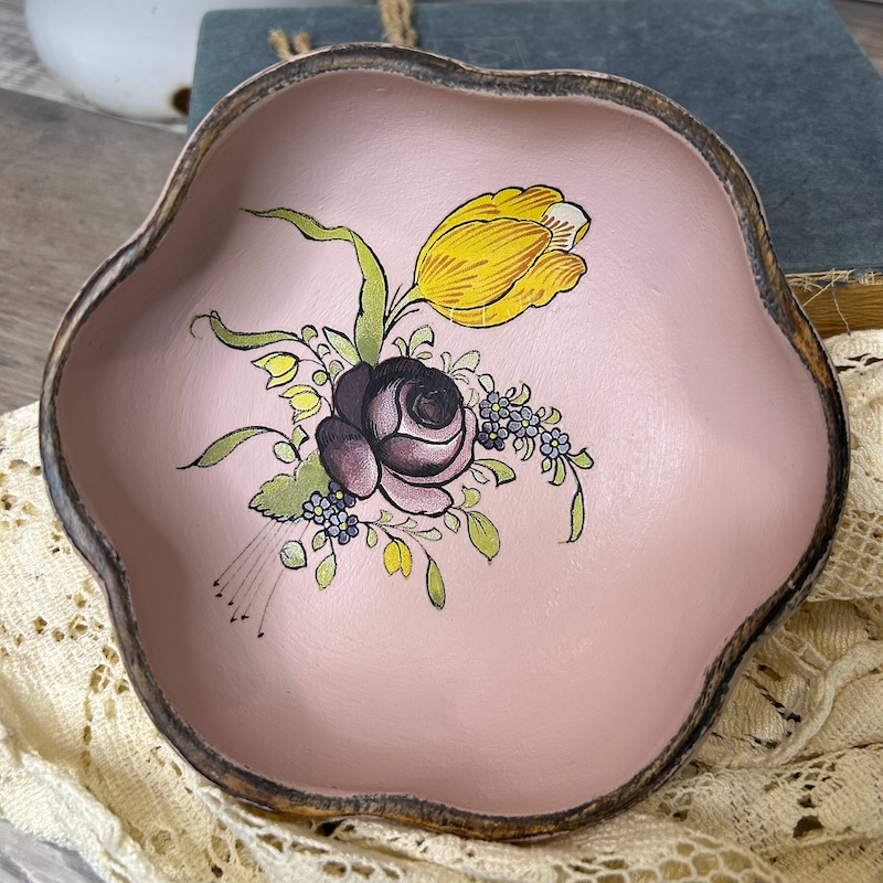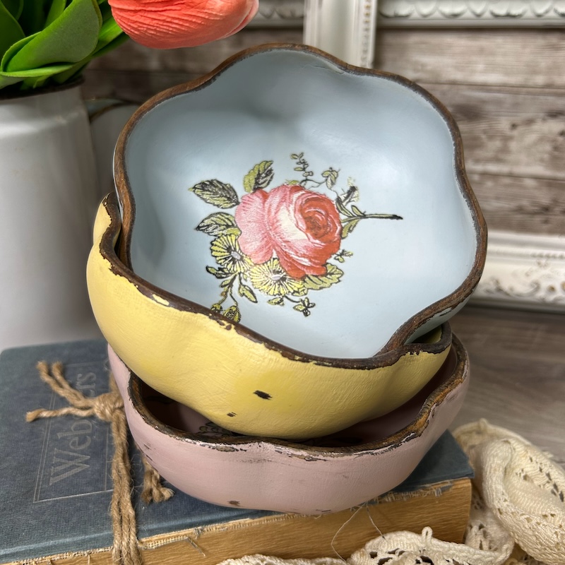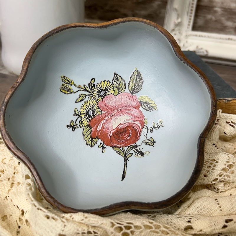 These upcycled wooden bowls have been painted, a floral transfer applied and distressed. They each measure approximately 5.75″ x 5.75″ x 1.75″.
