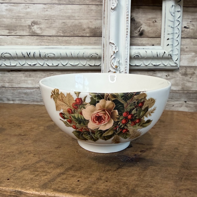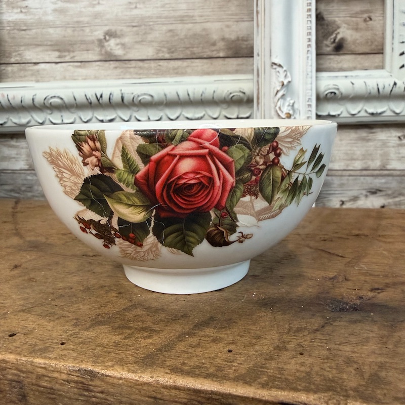 Each of these small bowls has been dressed up with a beautiful rose transfer from Iron Orchid Designs. Perfect for the holidays or to display all year long, these little bowls make an ideal candy dish. The decor transfer has been sealed in with a gloss spray, but these are not food safe and are strictly for decor or small wrapped candies.