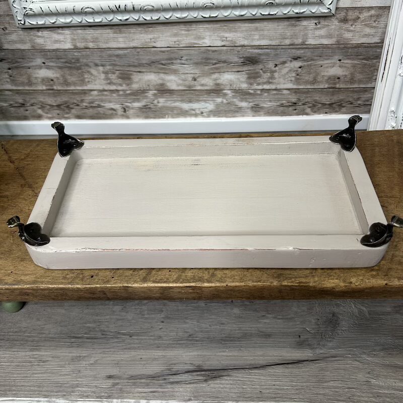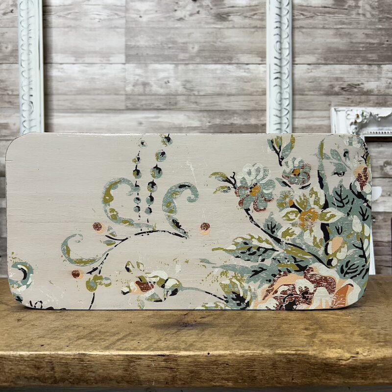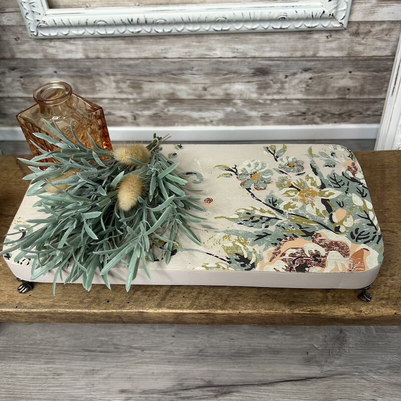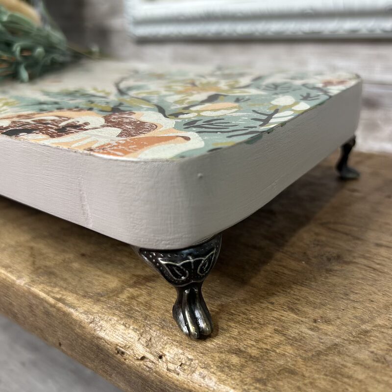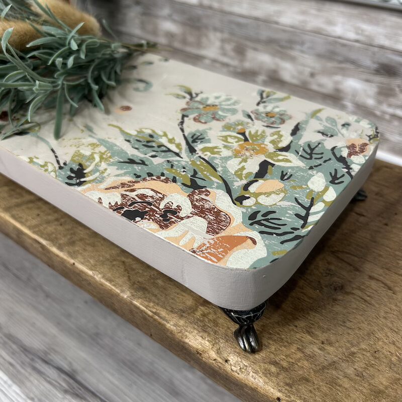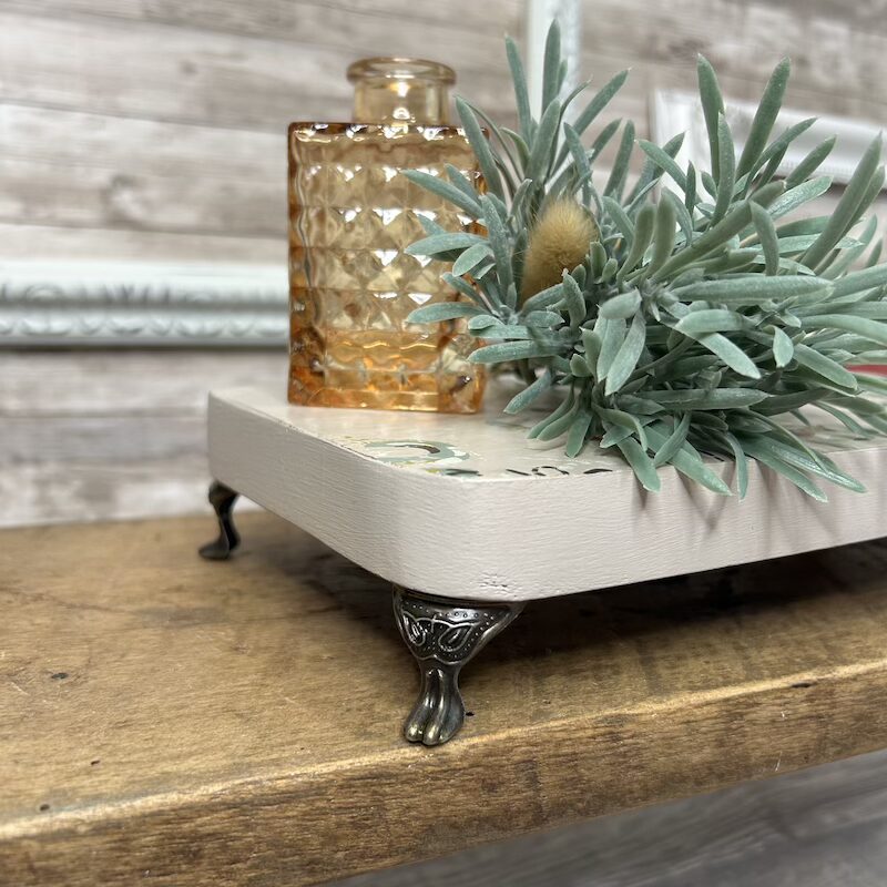 The previous life of this little riser was as a small wooden tray. It’s been transformed with a fresh coat of paint, a beautiful paint inlay on the top and 4 little metal feet have been added as well. It measures 12″ x 6″ x 2″.