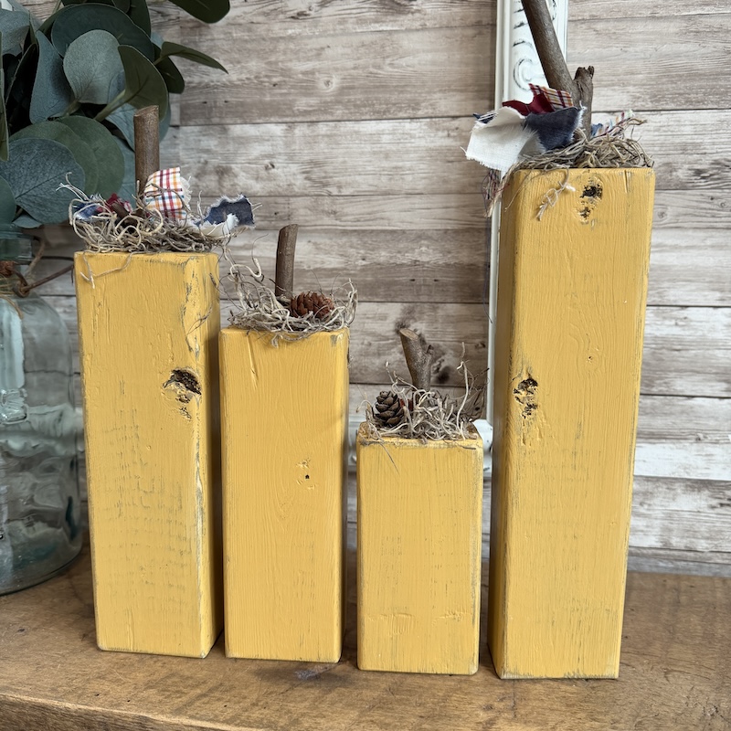 These up-cycled fence posts have been turned into the perfect piece of fall decor. The pumpkin blocks have a distressed yellow finish and the letters FALL have been hand painted onto the front. Each has been given a wooden twig for a stem and adorned with ribbons, mini pumpkins and pinecones and spanish moss.