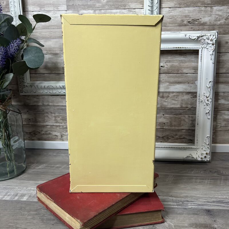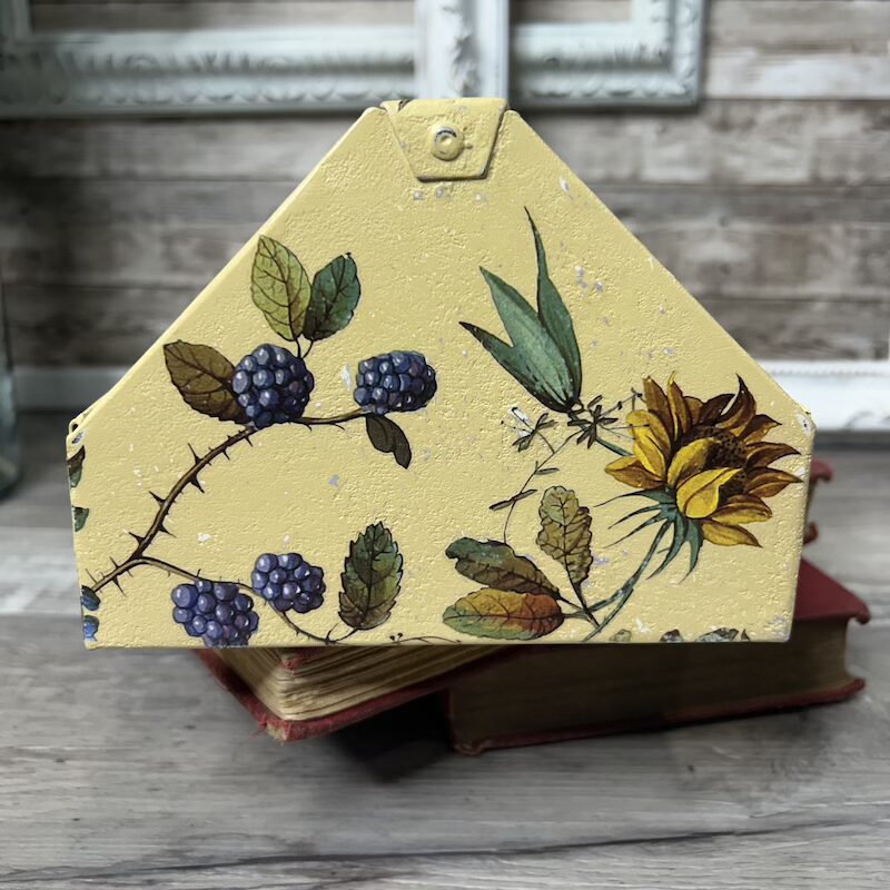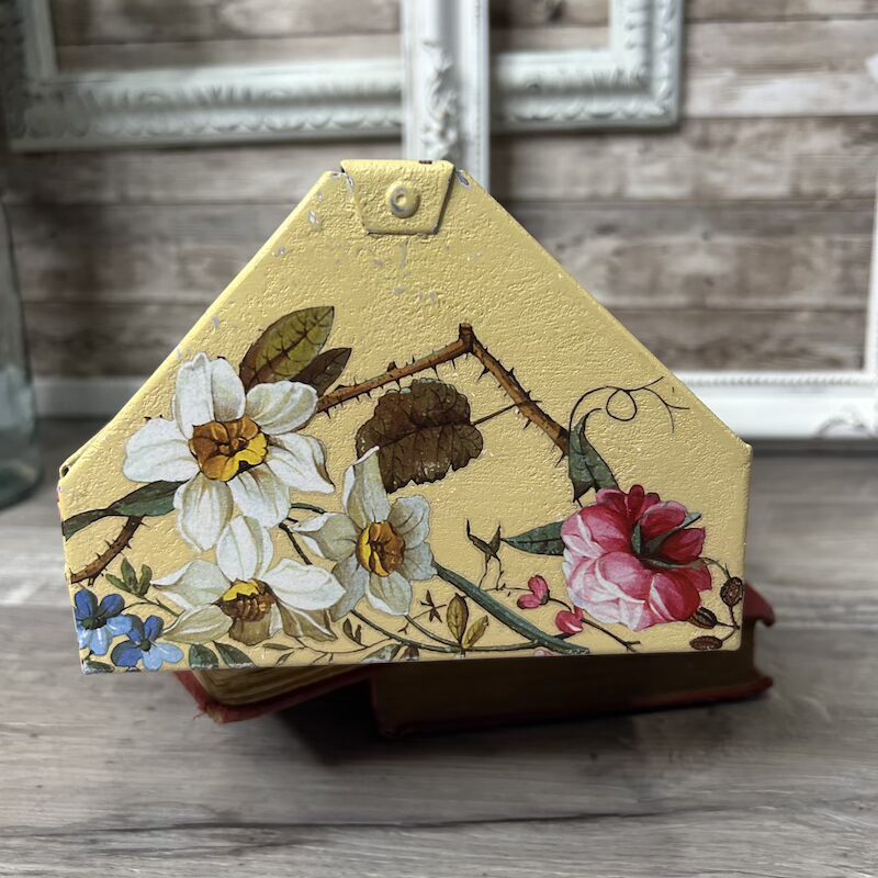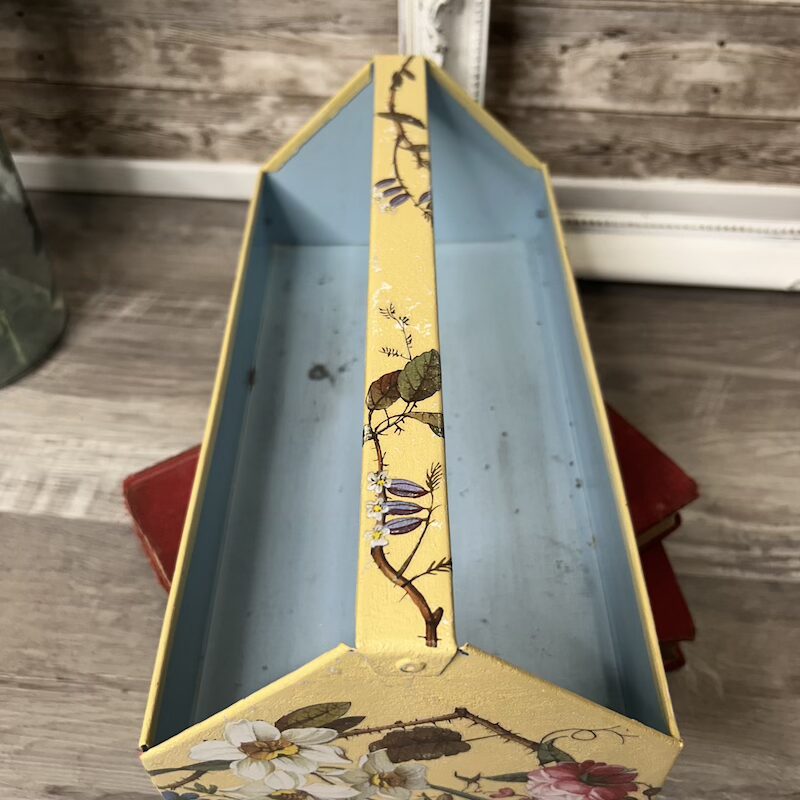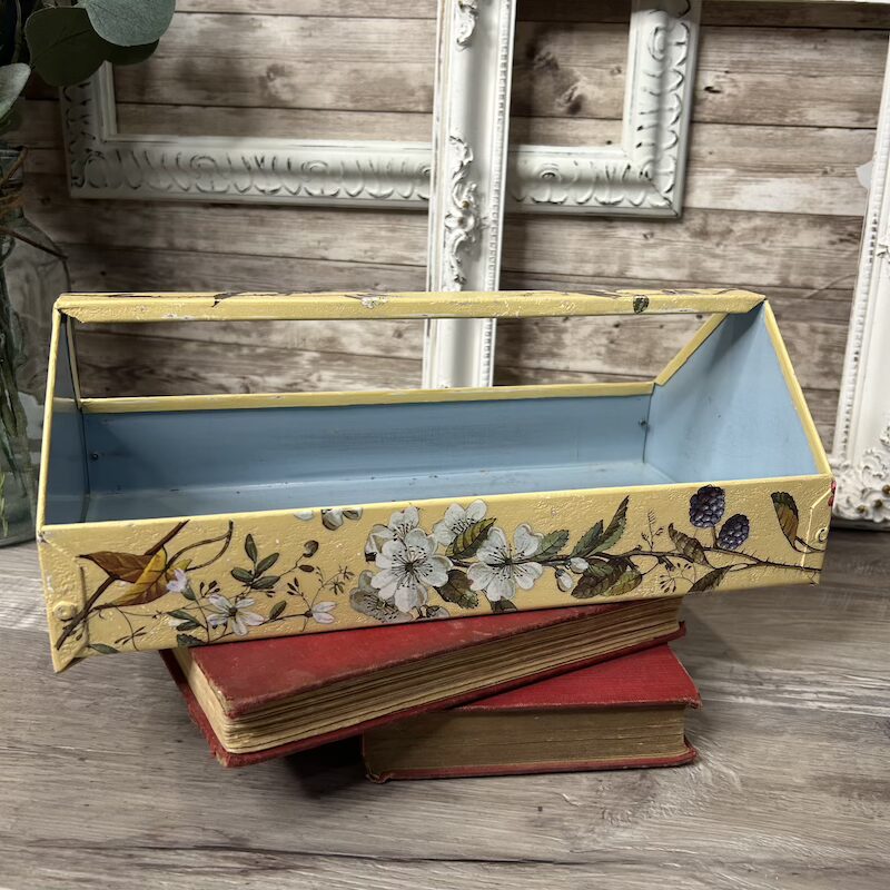 This metal toolbox insert has been transformed with texture, paint and floral transfers and is now a great addition to any room for display and small item storage. It measures approximately 12″ x 6.25″ x 4.5″.