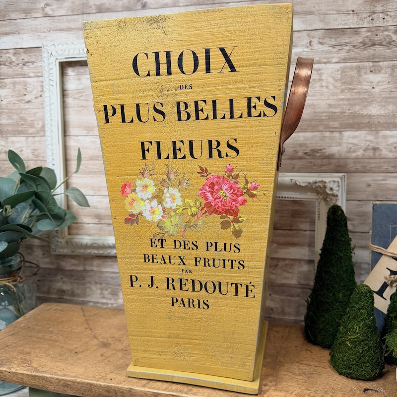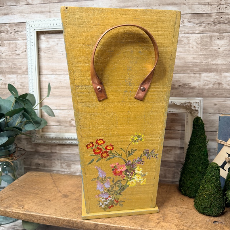This vintage wooden umbrella stand has been given a second life with paint and beautiful IOD transfers. This stand has copper handles and measures approximately: 16.25″ tall, is 7.5″ wide at the opening and the base measures 6.5″ across.