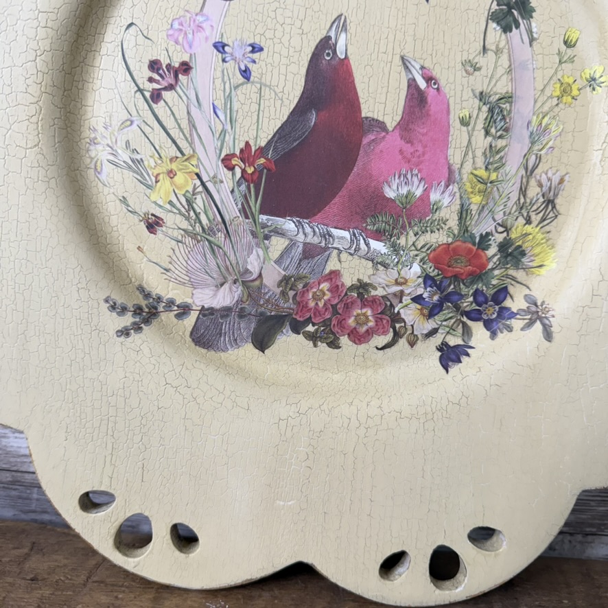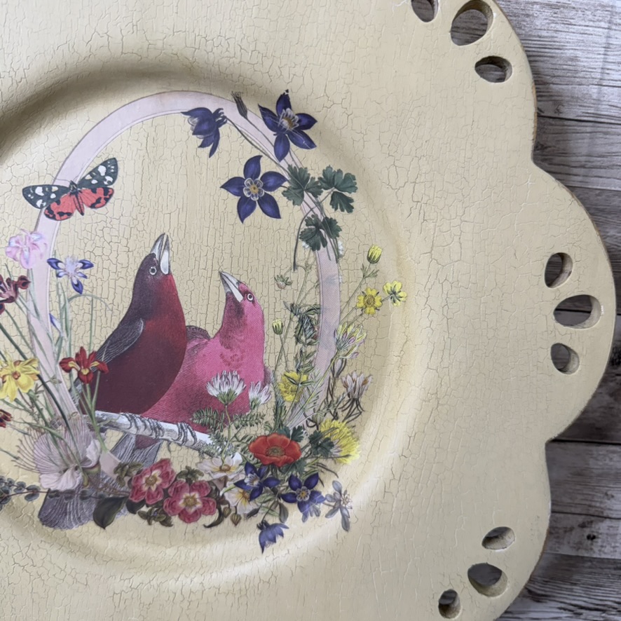This round wooden plate charger went from white to a creamy buttery yellow with a beautiful crackle finish thanks to milk paint. A bird and floral transfer from Iron Orchid Designs was applied for the finishing touch. It measures approximately 13.25″ in diameter.