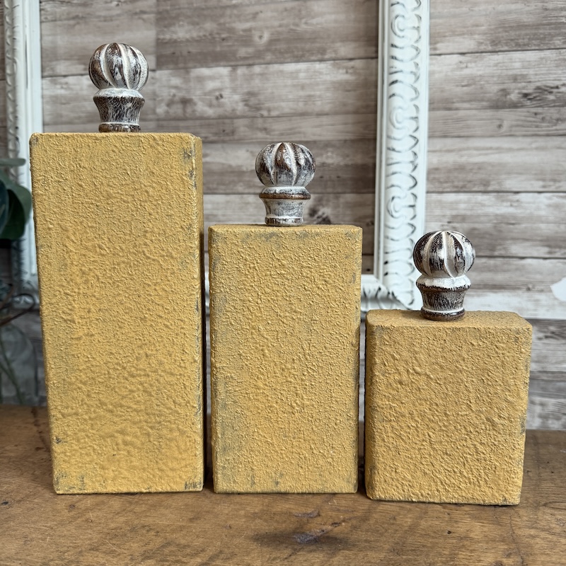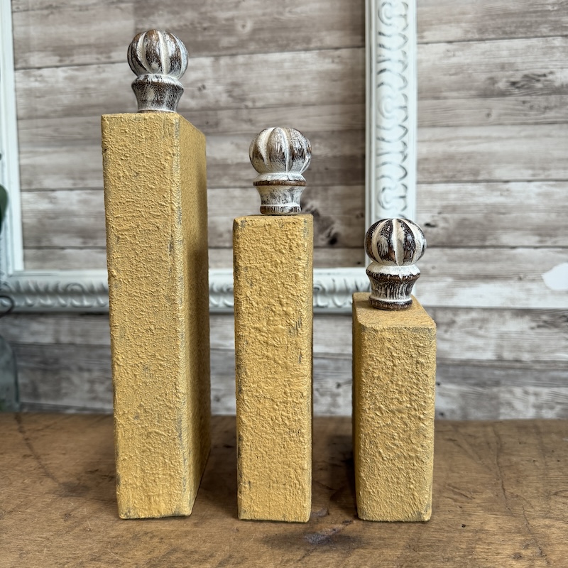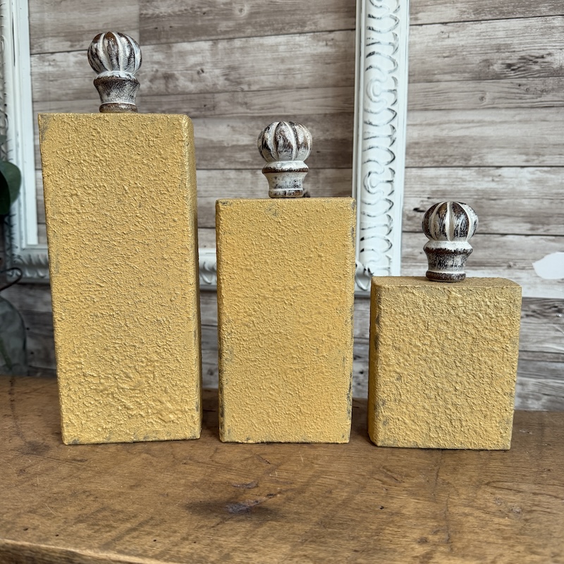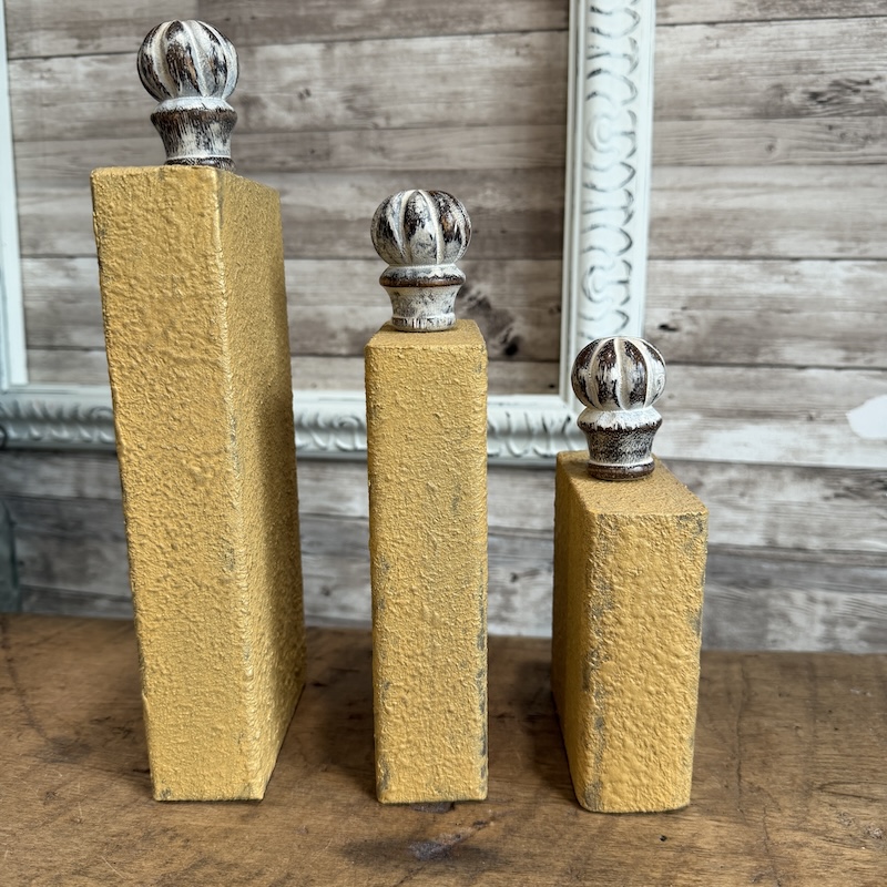 These plain 2×4 blocks have been painted with a textured yellow paint and buffed lightly with a gold wax to catch the light.